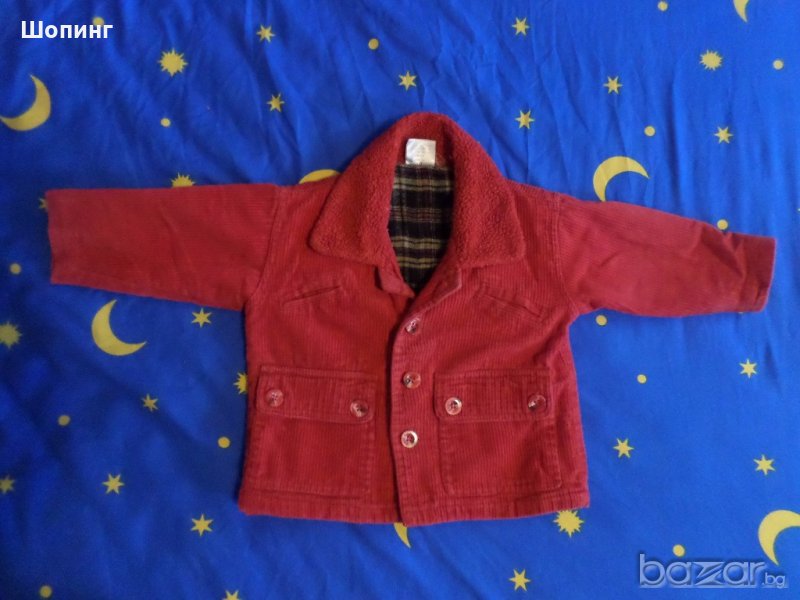 Червен жакет за дете на 1 г. от рипсено кадифе. Дължина 35 см, ръкав дължина 25 см, Ширина от подмишници при закопчано състояние 37 см.