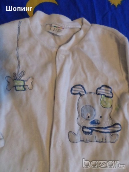 3. Памучно светлосиньо с шарки кученца. Цяла дължина 65 см. 31см ширина гърди от подмишници. То е по-износено от другите две и е подарък.