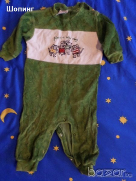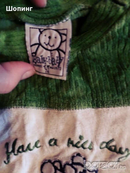 1. Тревисто тъмнозелено, марка H&M, р.74, Рипсено кадифе и плюш с апликация и надпис. От чатал до рамо 47 см, от чатал до долу крачол 23 см, В неразпънато състояние 32 см ширина гърди от подмишници.