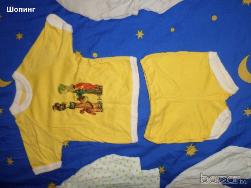 2. Памучен комплект в жълт цвят с картинка - блузка с къс ръкав ( Дължина 34 см, гръдна ширина от подмишници в неразпънато състояние 26 см.) и къси панталонки (дължина от чатал 19 см, талия обиколка неразпъната 59 см)