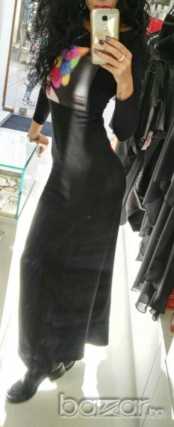 Дизайнерска дълга рокля с щампа. Роклята е уникална и стои страхотно, плътно по тялото е, а надоло е леко разкроена. От много плътна и стегната материя е и е подходяща да се носи и зимата. За слабо момиче е.Обличана е само веднъж и е без забележка.