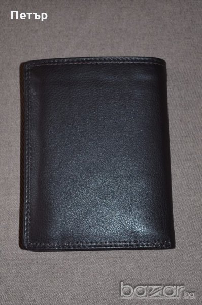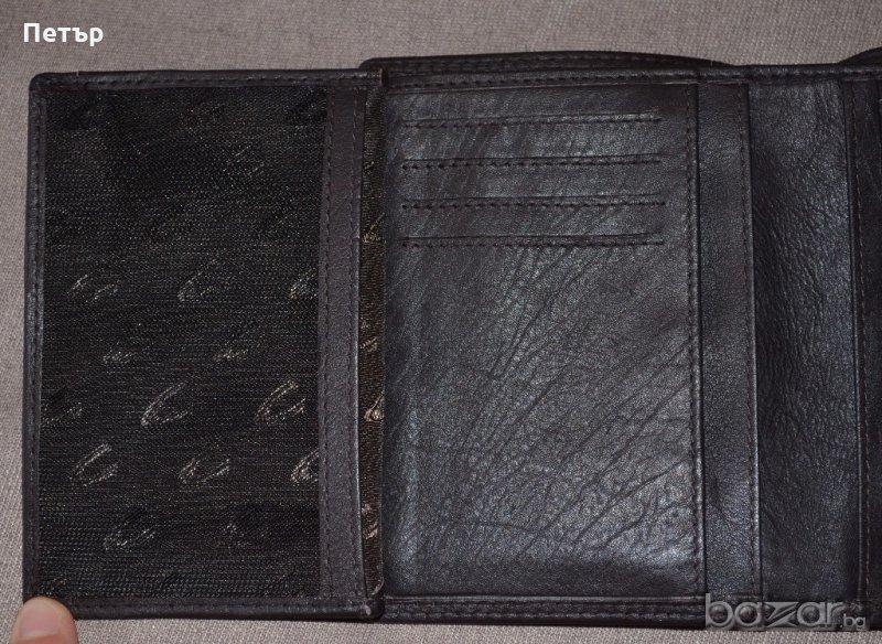 Пришито кожено лого на фирмата отпред на портфейла и надпис на фирмата от вътрешната страна на капака на отделението за монети.