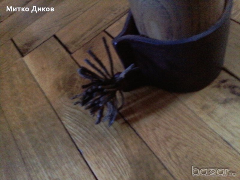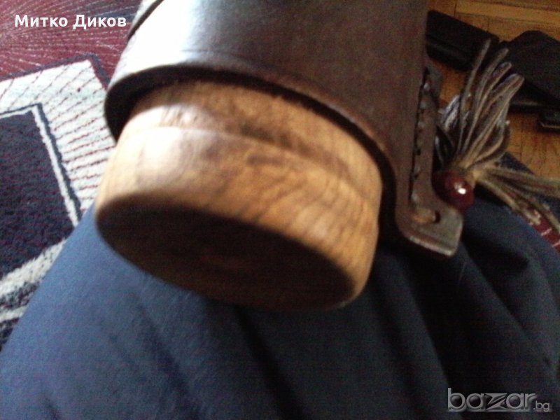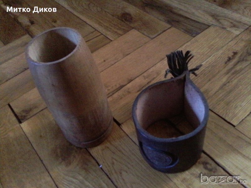 Чашата е дървена с диаметър горе на отвора 50мм и долу 62мм-височина 135мм -дебелина дървото 3мм на коженото калъфче-4мм-има надпис София някакво предприятие на коженото калъфче-то може и да се поставя за държач на стъклена топла чаша-изпращам по еконт с отстъпка