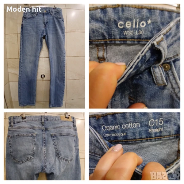 3. Цена 6,50 евро. Дънки Celio. Еластични /99% органичен памук, 1 % еластан/. Прав модел. По етикет са размер W30/L30. Дължина 98,5 см., от чатала 73 см. Талия дностранно от 37,5 до 42 см. Ханш едностранно от 47 до 52 см. Отлични, без забележки.