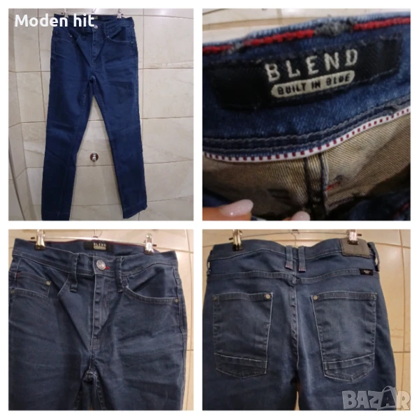 4. Цена 6,50 евро. Дънки BLEND. Еластични /98% памук, 2 % еластан/. Прав модел. Дължина 100,5 см., от чатала 76,5 см. Талия дностранно от 37,5 до 42,5 см. Ханш едностранно от 45,5 до 53,5 см. Отлични, без забележки.