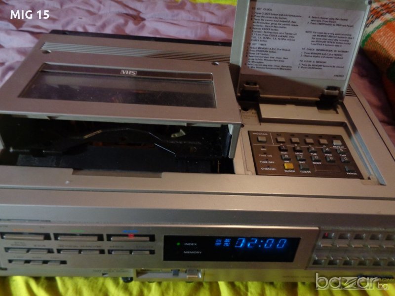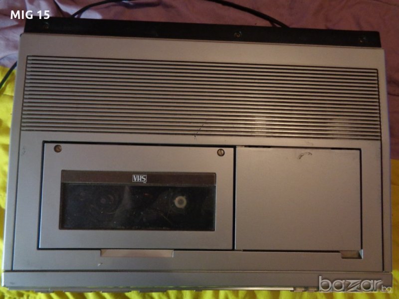 Много запазен , но не работи както трябва.Приема касетата (VHS), но като се натисне PLAY започва да се мъчи , не може да я завърти.Иначе я превърта и напред , и назад.Капака за касетата се отваря безпроблемно.Няма дистанционно.
