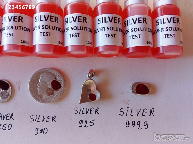 среброто в даден предмет. С помоща на този тестер можете да определите каква проба е среброто, като се ориентирате по различната цветова гама която се получава при различно съдържание на сребро в даден детайл или предмет, или казано по друг начин...при проба 0,500 се появява кафяво- зеленикав цвят, при проба 0. 700 се появява кафеникав цвят, при проба 0,900 се появява тъмно червено , при проба 0,925 се появява червен цвят и при проба 0,999 се появява кърваво червен цвят. Тестването не е сложно, само трябва да се капне една капка от тестера на дадения предмет или детайл и след няколко секунди се появява цвета отговарящ на процента сребро в самия детайл. ВНИМАНИЕ: При закупуване над 10 броя, доставката се поема от мен + бонус 2 от мен, при закупуване на 5 броя получавате бонус + 1 от мен, ако имате въпроси моля питайте, всичко се вижда на снимките които са с добро качество, минимално количество за закупуване е 2 бройки, можете да си поръчате колкото искате! Имаме количества !