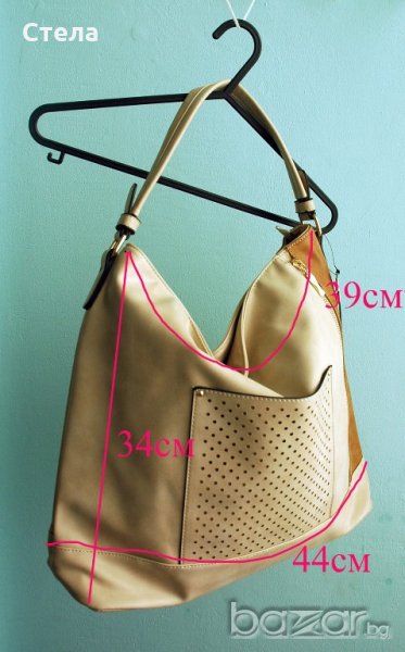 Размери: виж снимките. Дъно – ширина около 13-14см. Дължина дръжка – 40см. Няма допълнителна дръжка. С вътрешен и външен джоб (заден) и декоративен джоб (преден).