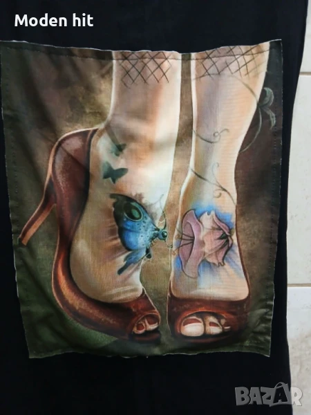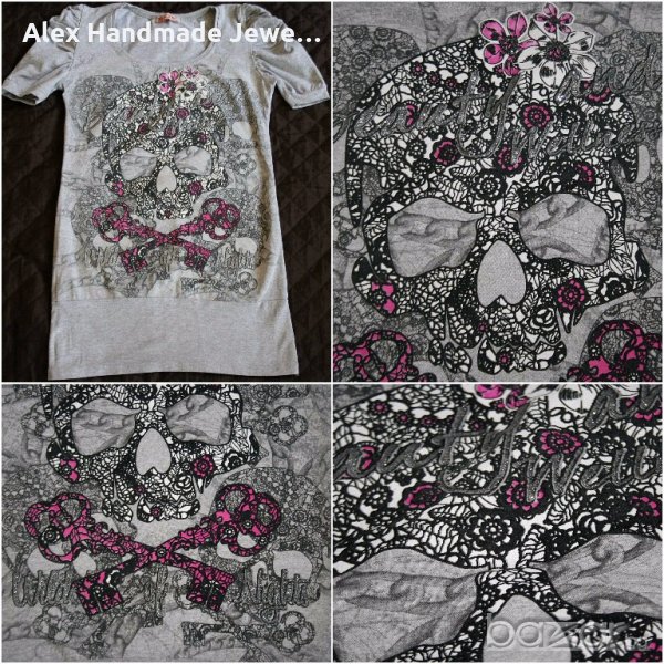 5. Цена 2,50 евро Тениска/туника с щампа череп. 95% памук, 5% ликра. Няма размер по етикет. Има голяма еластичност. Дължина 70 см., мишници: 41 см. Отлична.