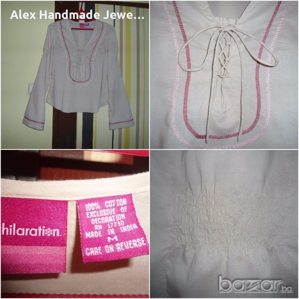 6. Цена 2,50 евро. Нова дамска риза - светло бежова. Блузка/ризка - Отпред е с връзки, а на кръста отзад има ластик. Ръкавите са много ефектни. 100% памук, материята няма еластичност. Нова, без етикет.