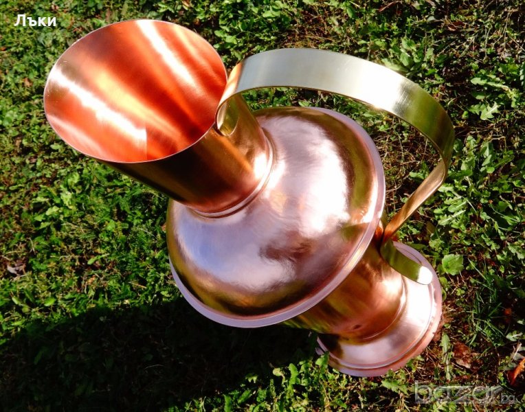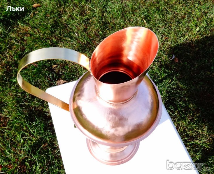 Старинна белгийска кана,ваза,поставка за чадъри,бастуни,майсторска ръчна изработка от чиста червена мед с яка дръжка от масивен бронз..Вътре не е калайдисана,идеална за ползване.Височина 49 см.,ширина 33 см.Тегло 2.5 кг.Перфектна.