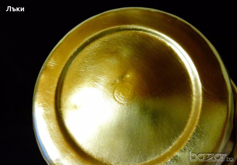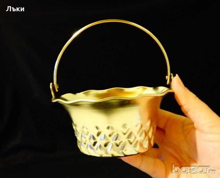 Немска бонбониера,кошничка,ръчно изработена от месинг.Височина с дръжката 14 см.,диаметър 13 см.,тегло 160 гр.Обем 300 мл.Перфектна.