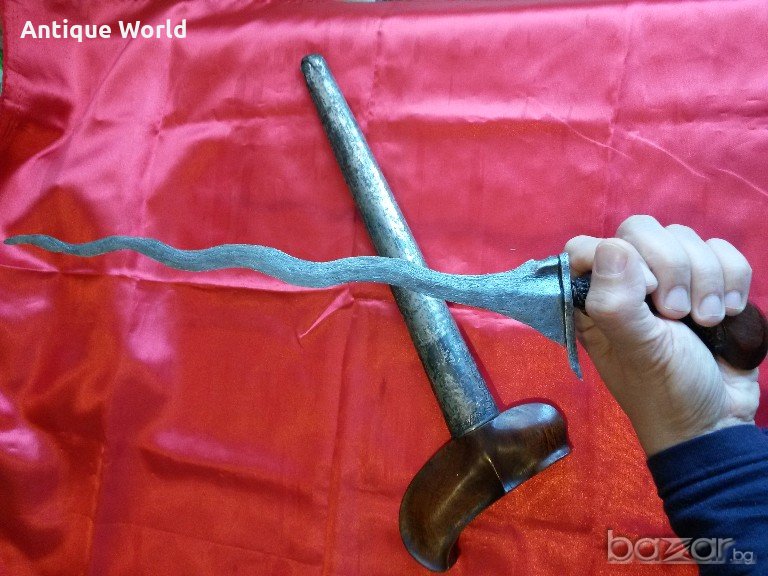 Уникална Малайзийска Кама КРИС ,Керис от 19Век..Змиевидно Резливо Острие, Ръчно изковано от Многопластова Дамаска Стомана ( Памор ), СРЕБЪРНА Кания.С непочистена Благородна Патина!