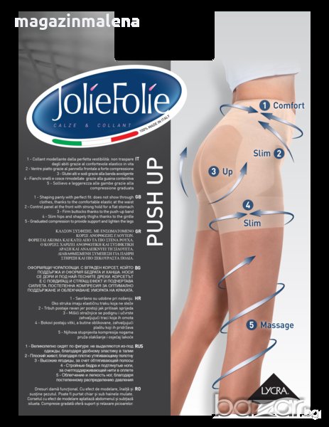 Jolie Folie Push Up 40 прозрачен и гладък стягащ чорапогащник с плътност 40 DEN, който е подходящ е за дами с разширени вени и/или за дами, които стоят продължително време изправени, произведен от италианската марка за чорапогащници бразилско дупе Jolie Folie/ Жоли Фоли. Чорапогащникът има стягащ корсет в горната част на краката и талията, който подчертава силуета и оформя краката и бедрата. Моделът има 5 етапа на стягане и коригиране: 1 - приляга перфектно - не личи под дрехите, благодарение на удобния ластик на кръста; 2 - коригиращо уплътнение на корема за плосък корем; 3 - стяга бедрата и ги прави по-добре оформени заради коригиращият пояс; 4 - стяга и повдига задните части, благодарение на повдигащите (push-up) лента; 5 - завършена и постепенна компресия, която осигурява стегнатост и облекчава максимално краката. Продуктът е с ограничител (не е изчистен до кръста); има парче между краката; на всяка опаковка е изписано, че е 100% произведен в Италия ( 100% MADE IN ITALY ) с италианско знаме като доказателство за произход. Цената е за 1 бр.