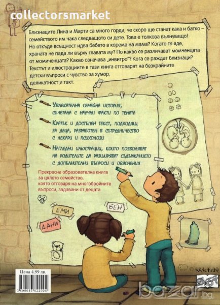 Близнаците Лина и Марти са много горди, че скоро ще станат кака и батко – семейството им чака следващото си дете. Това е толкова вълнуващо! Но откъде всъщност идва бебето в корема на мама? Когато тя яде, храната не пада ли върху главата му? По какво се различават момченцата от момиченцата? Какво означава “инвитро”? Кога се раждат близнаци?