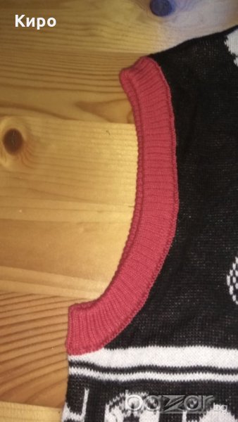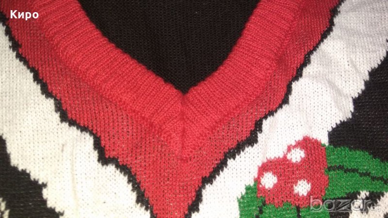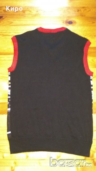 Черен с бели мотиви с червени ръкави и яка. Без забележки и следи от употреба. Не различим от чисто нов свежичък,чистичък,изключително привлекатен, готин и несериозен!