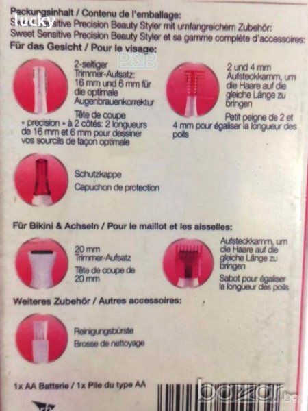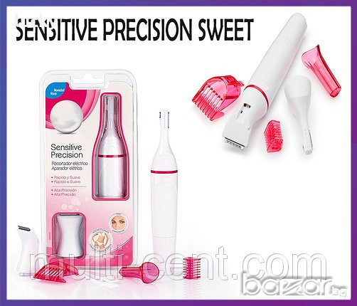 SWeet Sensitive Precision представлява електрически тример за нежно бръснене и прецизно обезкосмяване на най-деликатните зони на вашето тяло - бикини зона, лице, подмишници. Това е първият автоматичен електрически уред, разработен специално за чувствителните части на тялото, който помага за лесното и прецизно оформянае на деликатните зони. Лесен за употреба, SWeet sensitive precision премахва косъмчетата нежно, без директно докосване до кожата и без страх от порязване. Благодарение на различните по големина глави и специализираните аксесоари, можете да постигнете висока прецизност, като същевременно оформяте и стилизирате. С новият SWeet Sensitive precision винаги ще изглеждате перфектно, без никакви специални усилия.