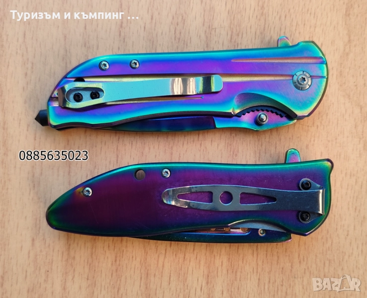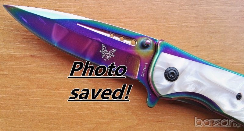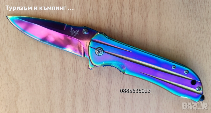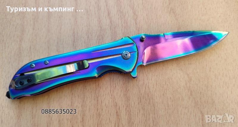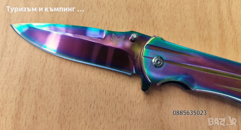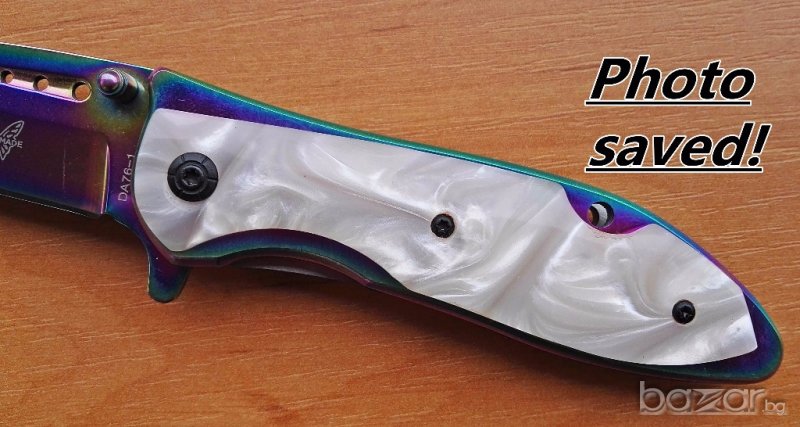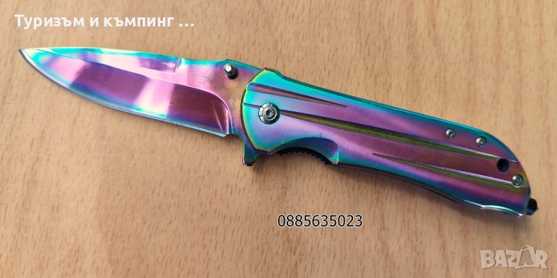 Металната част на острието отразява светлината в различни цветове, т.е. ножа е тип ,,хамелеон,,