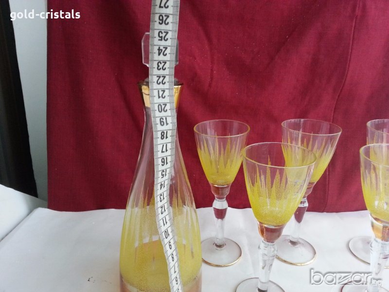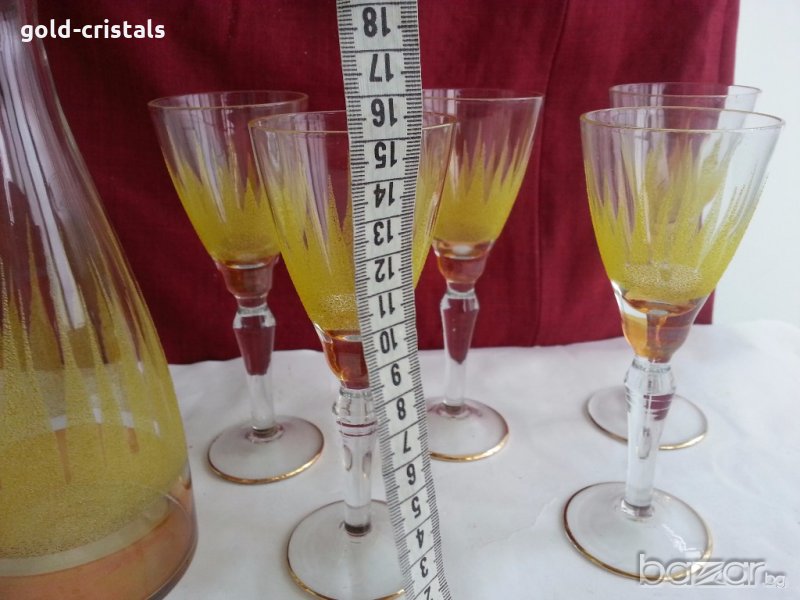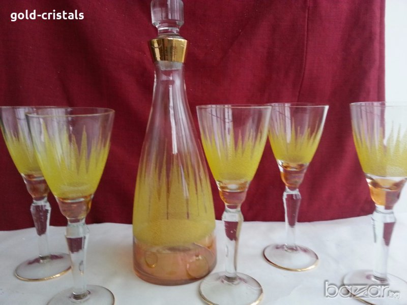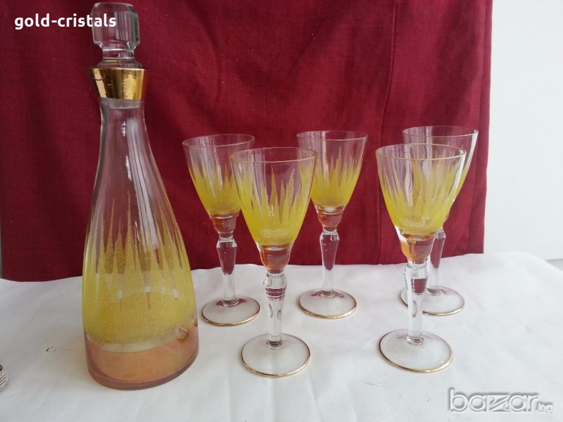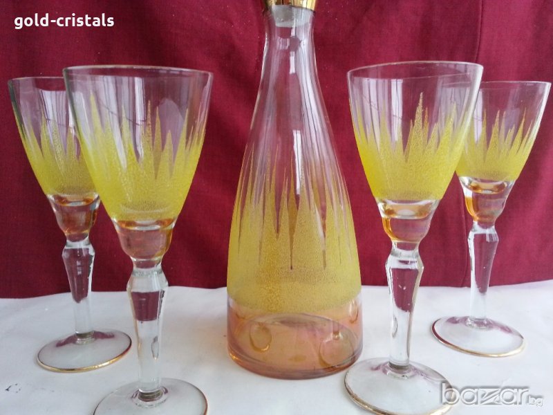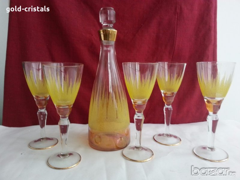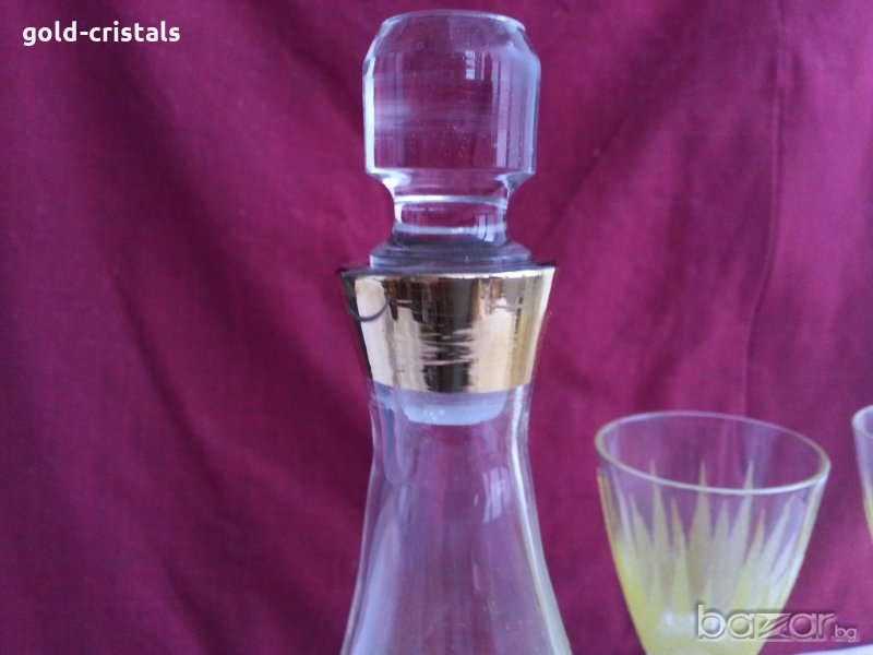 Ретро стъклени чаши и гарафа и 5 бр чаши за вино и ракия с позлата без забележки стар старинни антикварни ретро арт винтидж колекция цветно стъкло гравирани чаши на столче бутилка шише стъклена тапа стари антикварни предмети обзавеждане за дома и семейството подходящи за подарък за ценители и колекционери