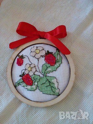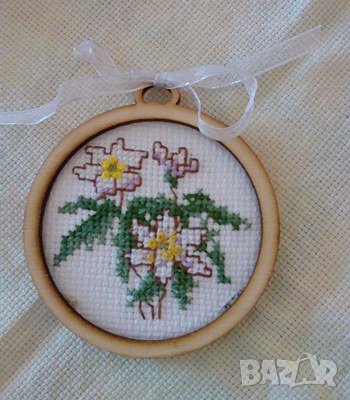 ръчно изработен малък гоблен, монтиран в кръгла рамка 8 см, декориран с панделка
