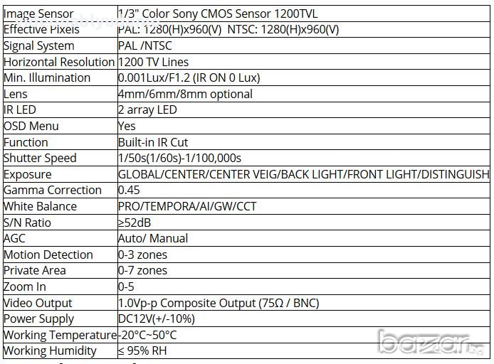 Сензор на камерата : 1/3" COLOR SONY CCD 1200TVL