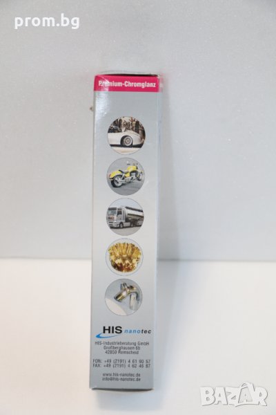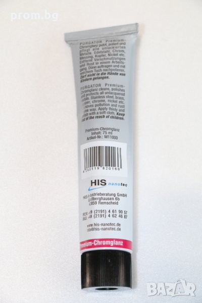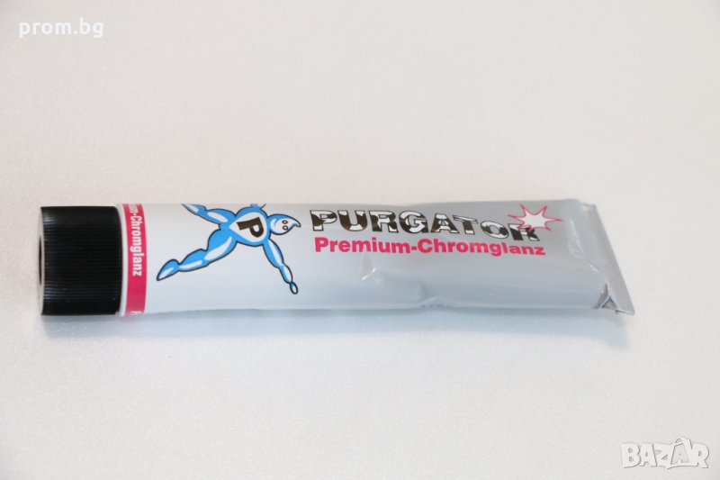 - Втори модел - паста хром 75 мл, PURGATOR Германия. За почистване и защита на метални повърхности, като хром, неръждаема стомана, мед, алуминий, никел и мед. Премахва повърхностно замърсяване и ръжда. Повърхността се гланцира.