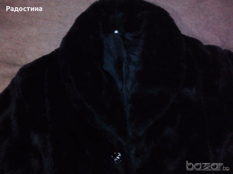 Черно,луксозно и меко,лъскаво,много запазено. Не е вталено,а разкроено.Дължина до коляно за 1,57 височина.Дължина на мантото 1м.Перфектно за висока жена.