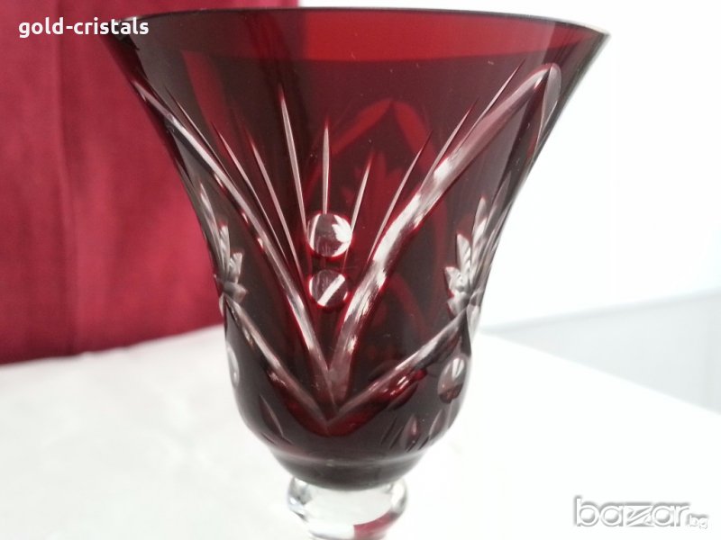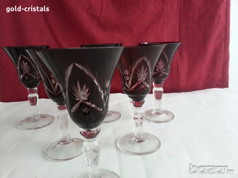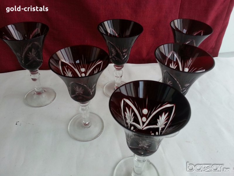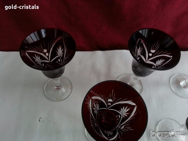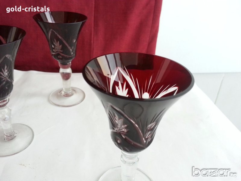 Ретро кристални чаши цветен червен кристал за вино 6бр -550лв за ракия 5бр -450лв сервиз комплект сет лот цветно стъкло ръчно гравирани чаши на столче ретро арт декор винтидж колекция стари за вино 6бр -290лв продадени стари антикварни предмети обзавеждане за дома и семейството подходящи за подарък за ценители и колекционери