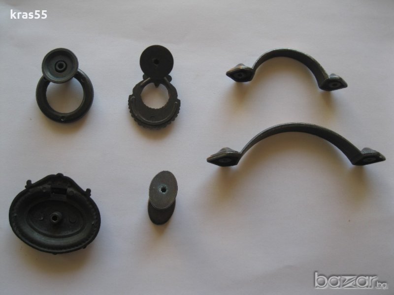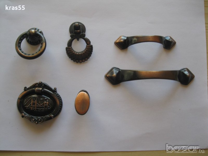 Ретро мебелен обков -различни видове.Разстоянието между отворите от сн.1,2 и 3 е 55 мм. а от сн.5 и 6 са 64 и 96 мм.Бройките са ограничени.Ако има въпроси и интерес моля пишете.
