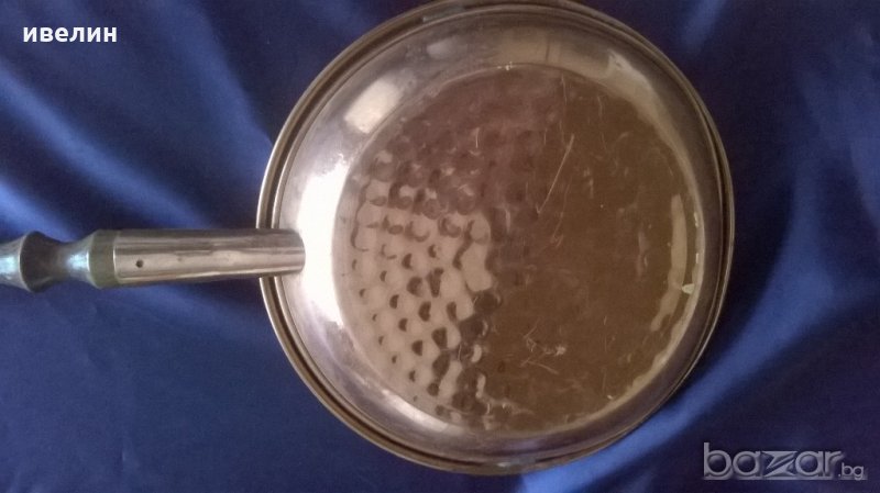 стар домакински прибор за декория.дървена дръжка,меден съд.дължина 60см,диаметър на съда 22см,състояние видно наснимките.капака е заварен/или залепен/-на последната снимка се вижда.внос от франция.