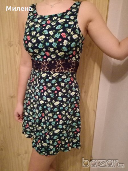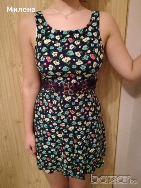 Рокля с флорални мотиви и дантела на талията с цип на гърба.