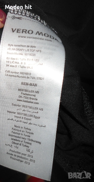 4. Цена 3 евро. Нова блуза Vero moda. Без етикет. Размер S, но е по-скоро за М, дори L. 100% вискоза. Дължина 63 см., мишници: 54,5 см., ръкав: 72/52,5 см.