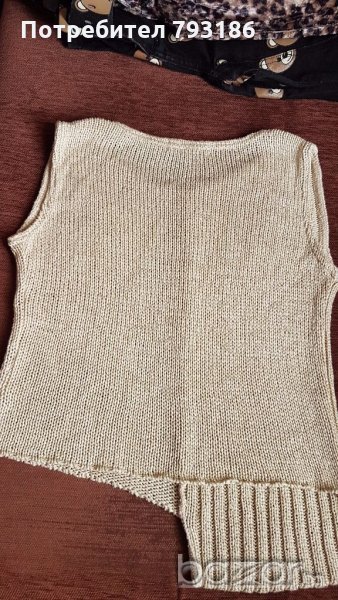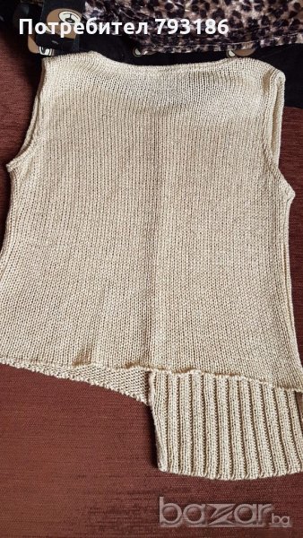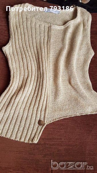 Стандартен размер /С/М/Л/,телесен цвят,плетена много фина материя.Може да се носи върху риза,поло или друга блузка с дълъг ръкав.Когато е върху панталон с колан,половиният колан с тока се вижда ,другата половина -не..много интересен модел.Само премерена/нова е /