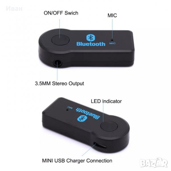 Използва се за безжична връзка между таблет , телефон , смартфон и т.н с други устройства със слушалков вход АUX като например авто аудио плеър .