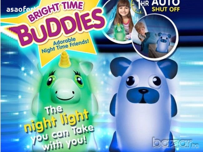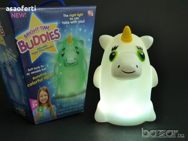 Кликнете върху нея, за да включите и да превърне всяко тъмно пространство в едно вълшебно място. Децата ще харесат редуващи се светлинки- от синьо, зелено и жълто. Всеки цвят осигурява меко, успокояващо сияние и помага на детето да заспи. Детската нощна лампа е с меко силиконово тяло и е достатъчно издръжлива, за да се справи с здраво гушкане или падане. На практика, лампата е нечуплива. В перфектен размер за легло, за нощното шкафче и е идеална дори когато пътувате, а детето не желае да се раздели със своя верен приятел. Вашето дете ще се наслади на спокойни сънища през нощта, закриляно от най- добрия си приятел