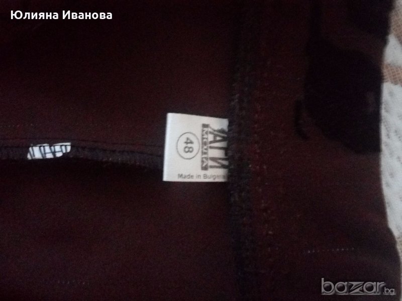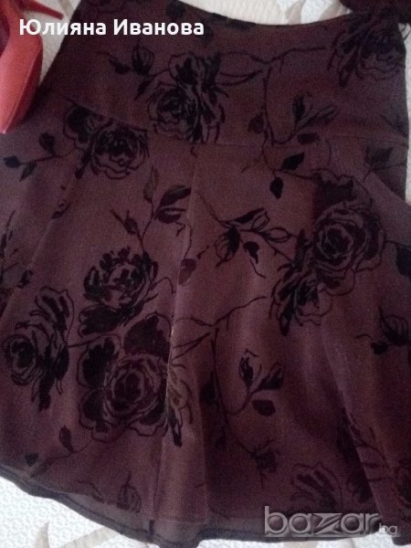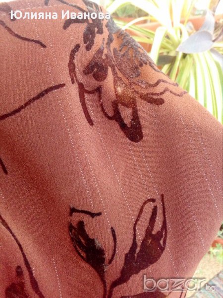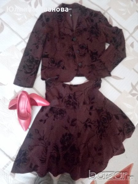 Невероятен костюм от плътна еластична материя-100% полиамид. Удобен, стилен и бутиков, подходящ за предстоящите празници. Цвета е наситено шоколадов със релефни цветя, които си менят цвета при движение (за съжаление на снимките не личи много добре). Костюмът е обличан един път по повод, но за съжаление ми е малък. За допълнителни въпроси и мерки и ми пишете.