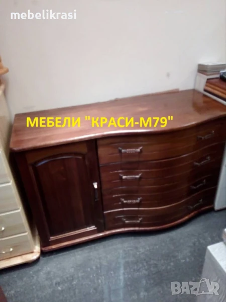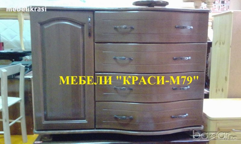 Скрин 120 с извити чекмеджета и врата-масив в цвят.Скринът е изработен изцяло от естествено дърво-БОР в цвят .С 4 извити чекмеджета и 1 врата . Монтираните старинни дръжки придават завършен и стилен вид.