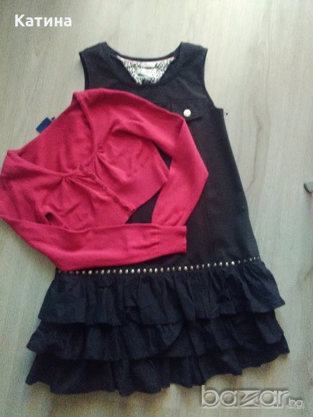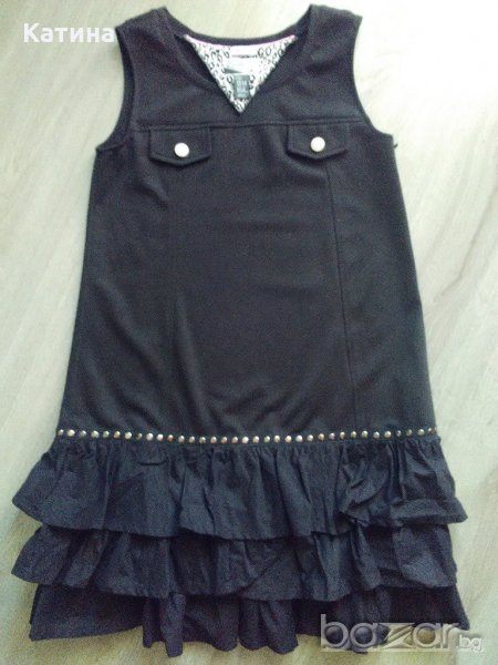 Страхотен модел от плътно,леко еластично трико,завършващ с три пласта къдри.Декорирана с метални елементи.Закопчаване с цип встрани.Размер на етикета 13-14 год.,164 см.Нова,с отстранен етикет.