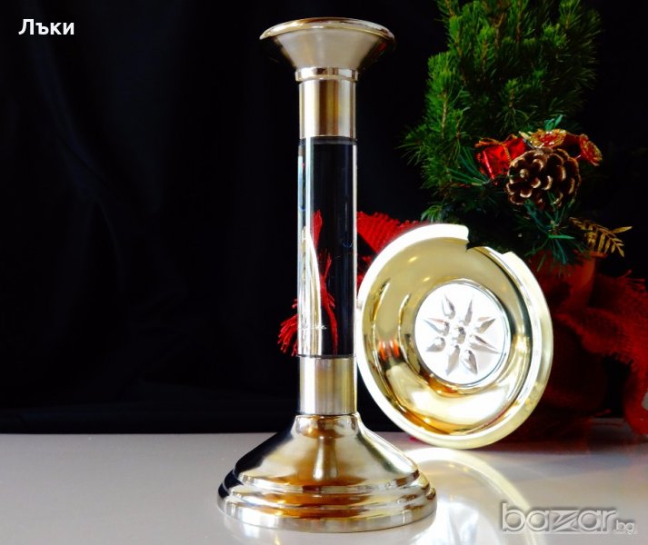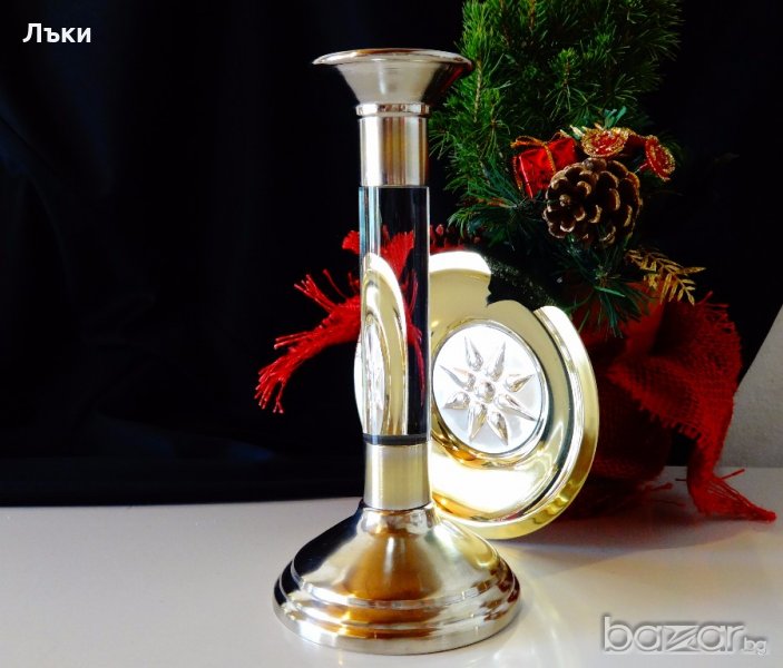 Старинен свещник,изработен от масивен бронз,дебело посребрен с висока проба сребро.Красиво и ефектно бижу с кристал.Височина 20 см.,диаметър