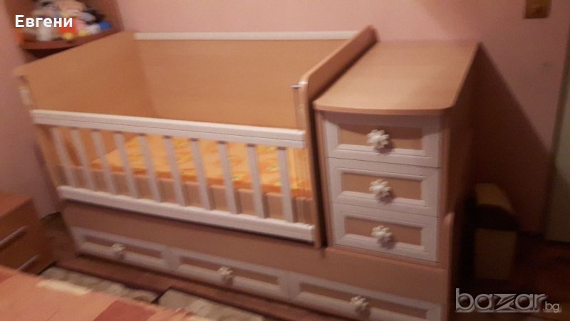 Кошара с матрак съставна от 3 части бюро скрин и легло размер на кошарата 130 на 75см тя може да се люлее има и степенни болтове за да не се люлее габаритите на цялата кошара 184 на 75 См над скрила има място за повиване до скрила има 3 чекмеджета под кошарата също има още 3 чекмеджета кошарата има преграда която се регулира на степени на горе и долу