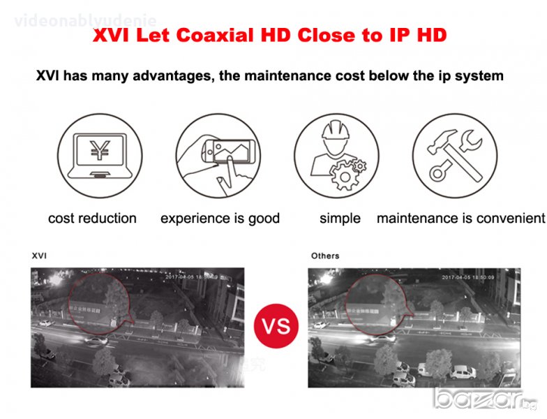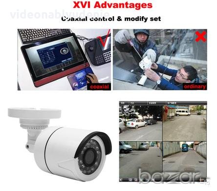 Най-нов модел XVI AHD-H видео камера от 5-то поколение с InfraRed подсветка от 24 IR LED диода, осигуряващи добра картина и голямо работно разстояние през нощта. XVI AHD-H (Analog High Definition - H клас - Супер високо качество) е нова технология с усъвършенствана CVBS (COMET*) & HD Видео трансмисия, позволяваща пренос на видеосигнал с мегапикселова резолюция 1080p по 75-3 коаксиален кабел на разстояние до 500 метра. Този вид системи не изискват изграждането и конфигурирането на мрежа, използват традиционната схема на свързване с коаксиален кабел и BNC конектори между камерата и видеорекордера, което прави възможно използването на съществуващи коаксиални трасета. Поради липса на компресиране на сигнала в камерата, технологията позволява наблюдение с мегапикселова резолюция, без закъснение/накъсване и без сложно конфигуриране. Липсата на допълнителни мрежови устройства - сървъри и софтуер, прави XVI AHD-H системата оптималното решение за мегапикселово видеонаблюдение – икономично, лесно за инсталация, надеждно и опростено.