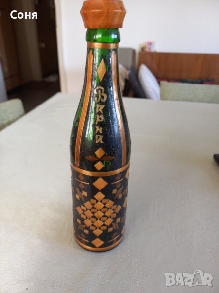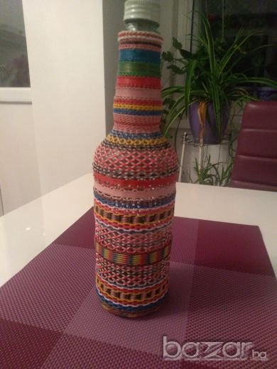 Бутилката е облечена като дамаджан. Оплетката е като битова шевица.