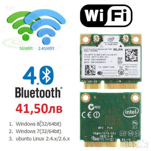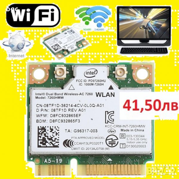 Безжична карта Intel AC 7260, 300/867Mbps, 7260AC, 7260SDW, 7260HMW, 7260NGW, HMWG.R chipset 7260-ac