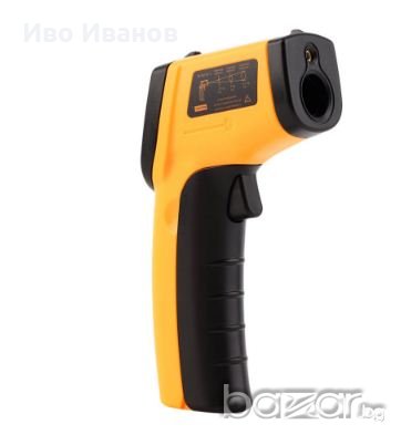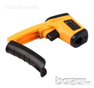 Компактен и здрав корпус, LCD екран, лесен за използване. Просто се прицелете и натиснете копчето, червената точка на лазерния лъч на обекта (например врящата тенджера) и отчетете от екрана температурата в градуси. Време за отчитане на температурата по малко от 1 сек, температурен диапзон от -50 до +330 градуса С. Точност на измерването 5% или 1.5 градуса С. Препоръчително разстояние за точно измерване от 15 см до 1 м. Има функция задържане на показанията след приключило измерване и функция автоматично изключване при липса на дейност. Захранване от 2 х 1.5V ААА батерии с индикатор за разредени батерии. Размери: 144.5 х 93 х 38 мм Удобен за използване не само в домакинството, но и в промишлеността, особено за изследване температурата на работещи електронни елементи.