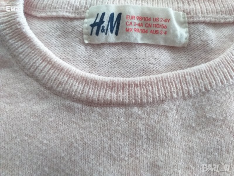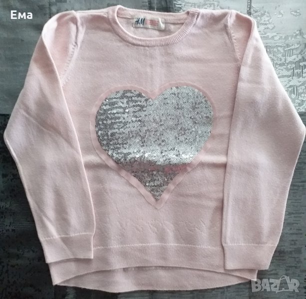 Втория пуловер в бледорозов цвят е с фина плетка и апликация сърце отпред. Като нов. Закупена от H&M. От 2-4 годинки.