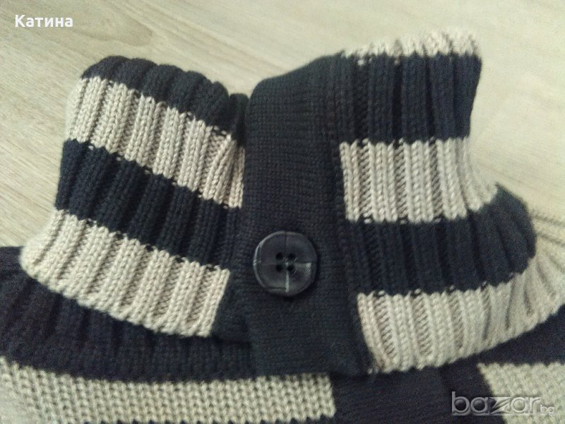 Страхотно пончо в сивокафяво и черно райе.Закопчаване в няколко варианта.Универсален размер.Обличано веднъж.Без следи от употреба.