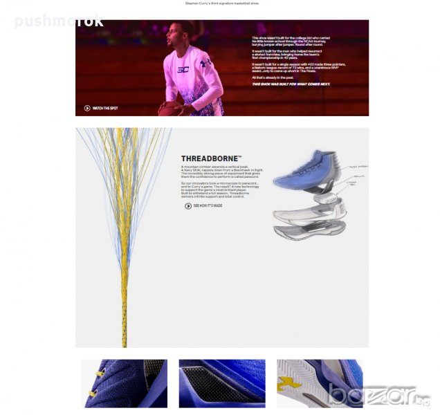 Under Armour Curry 3 е привлекателен модел на бранда, модел, който се оценява високо от професионалистите. Технологията на вградените „възглавници“ - Threadborne е голямо предимство, осигуряваща сила на посоката, за да поддържа блестящия играч на Голямата игра: Стивън Кърри / кецките са с неговия подпис /! Системата Charged