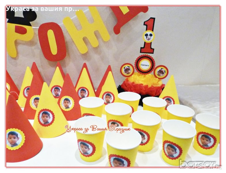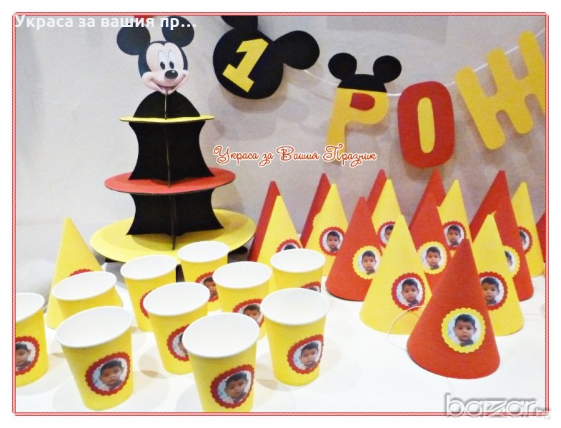 украса и аксесоари за детски рожден ден със снимка на детето и Мики Маус