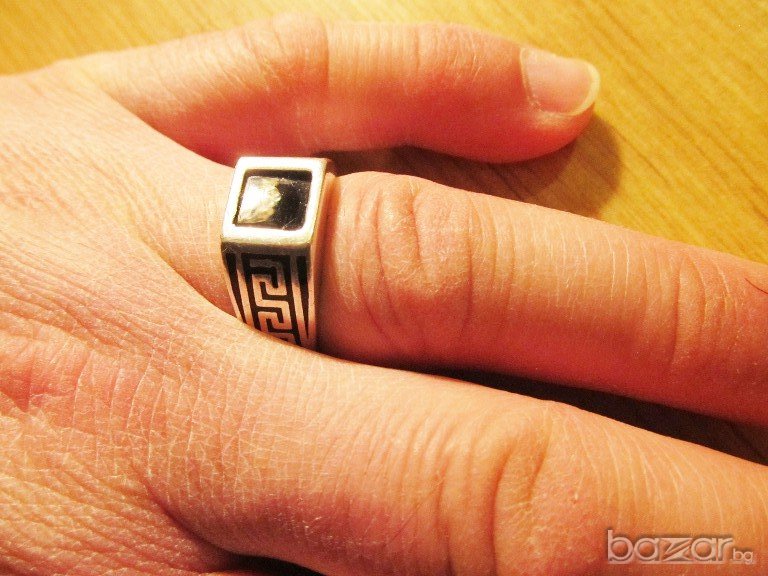 Уникален красив мъжки сребърен пръстен с черен камък и шарка