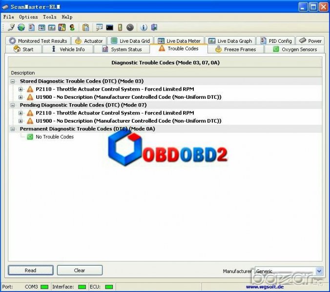 * Четете на диагностични кодове за неизправности, генерични и показване на тяхното значение (над 3000 в базата данни).